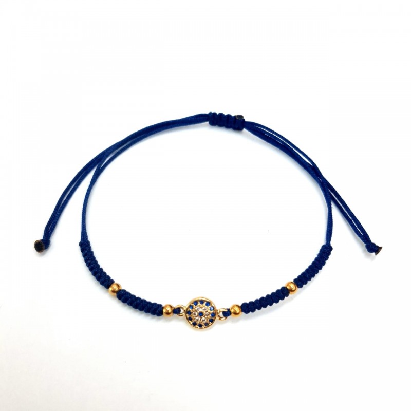 Detalles de pepitas y dije mandala en acero dorado con circones blancos y azules