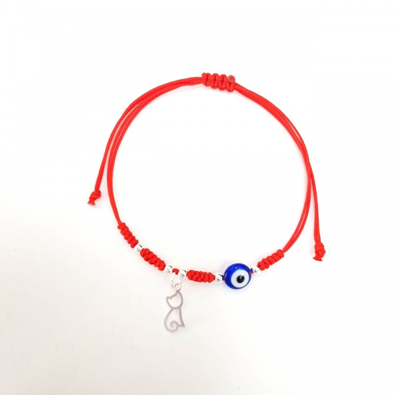 Aplicación de pepitas y dije con silueta de gatito, además del ojo turco azul (salud)